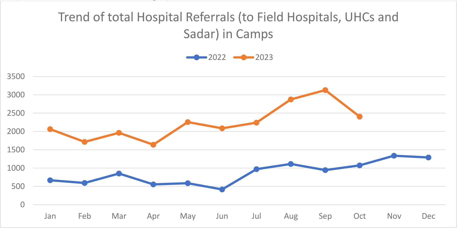 Figure 1: Trends of total Hospital Referrals (to field Hospitals, UHCs and Sadar) in Camps.