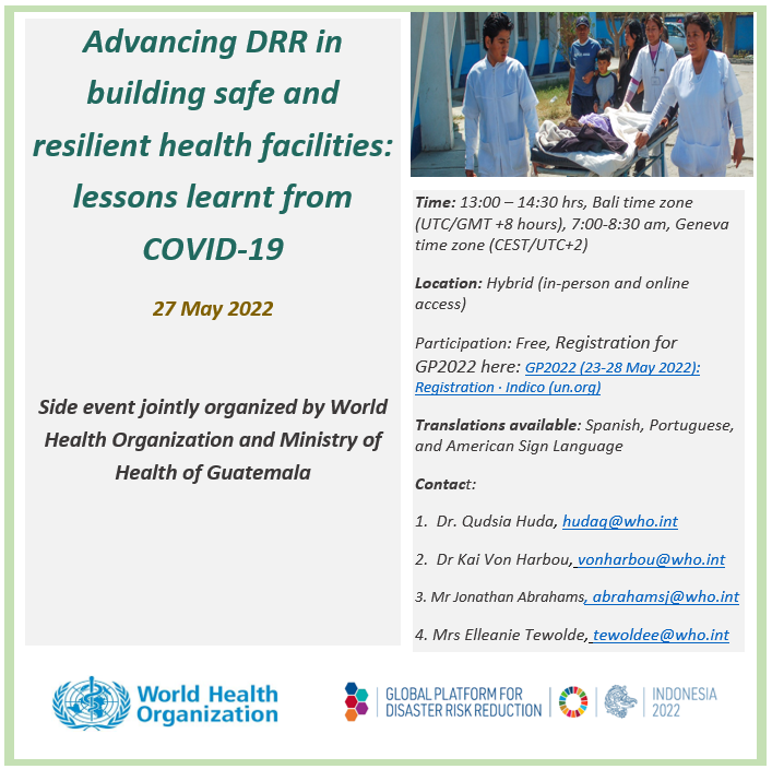 Emphasis will be on identifying and implementing good practices in health facility safety and resilience that contribute risk-informed and inclusive COVID-19 response, recovery and rehabilitation in humanitarian and low resource settings