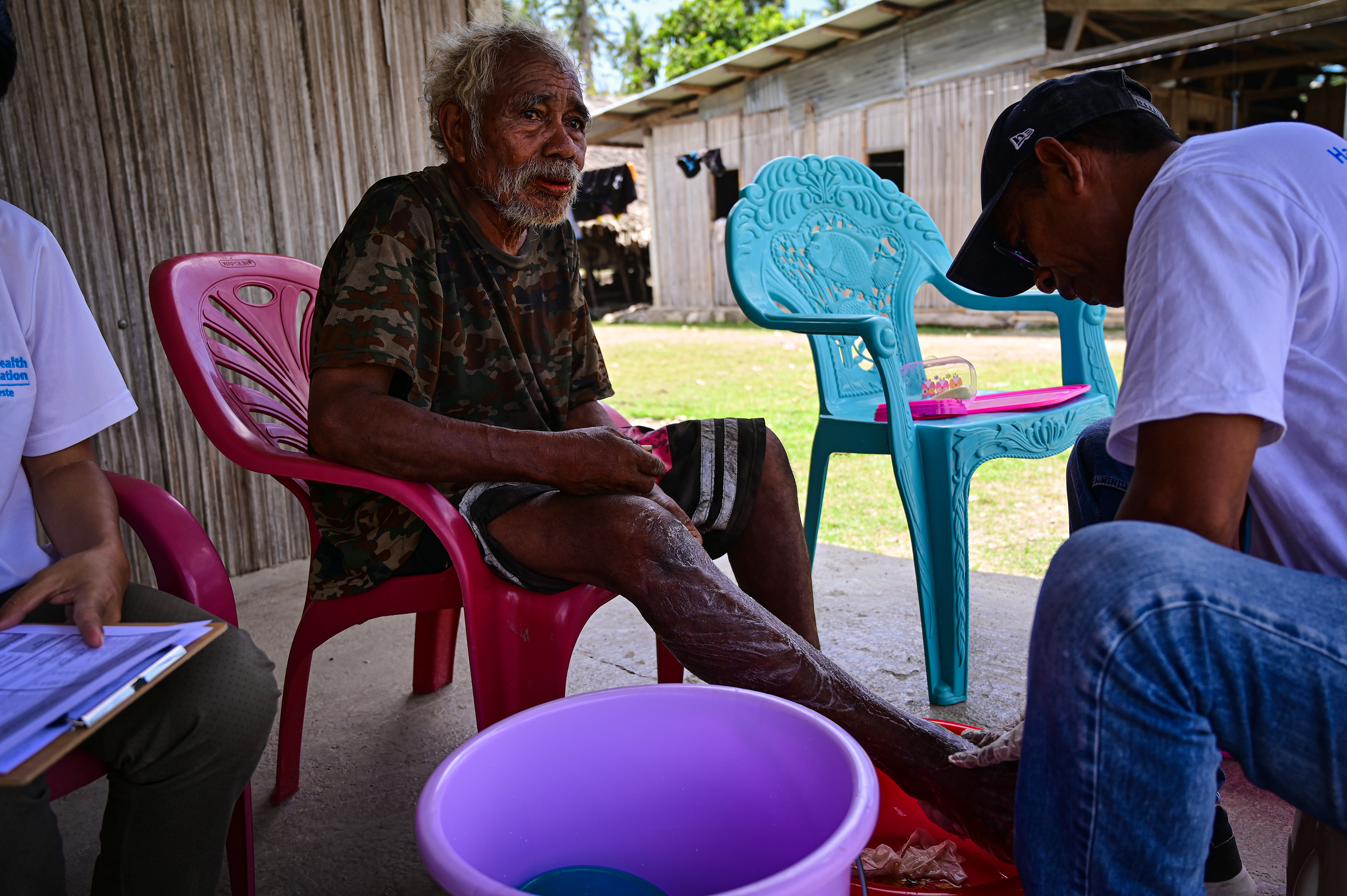 Eighty-one-year-old Fernando Ximenes, a lymphatic filariasis (LF) patient, went about his daily chores without sensing any pain. In the last week of October, the farmer based in Viqueque district of Timor-Leste, had a visit from a health team following up known LF patients for Morbidity Management and Disability Prevention (MMDP). When one of the healthcare workers began cleaning his left leg, he found a one-inch metal thumb tack lodged into his foot.